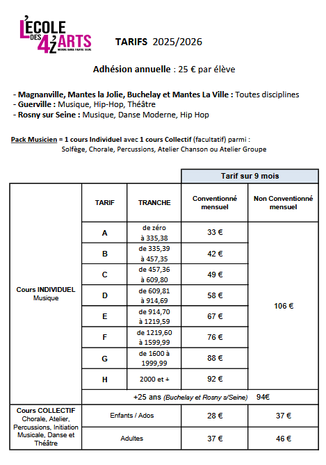 Les tarifs s'établissent en fonction du lieu de votre domicile, de l'activité choisie et pour la musique, de vos revenus.